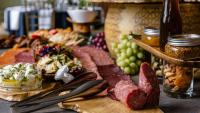 Served with fresh fruit garniture, walnut raisin crostini, French baguettes, gourmet crackers, mixed nuts, assorted dried fruits, and preserves.
